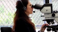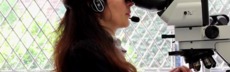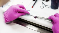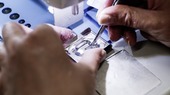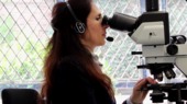 Da das eingebettete menschliche Gewebe nicht gleichmäßig in dem Paraffin-Block verteilt ist, muss die Laborantin einen großen Teil des hauchdünnen Materials aussortieren und nur die Gewebestreifen ins Wasserbad legen.